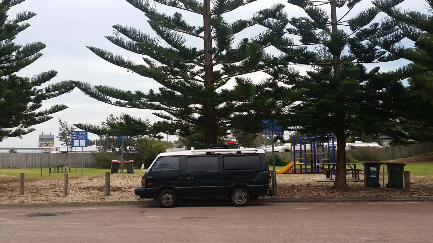 Letztendlich sind wir Coff´s Harbour gelandet. Hier haben wir auf einem Parkplatz mitten am Meer geparkt und gehofft, dass wir dort auch schlafen können, weil noch mehr Vans dort standen. Auf einem Schild stand aber ausdrücklich: Campen verboten, im Auto schlafen verboten!. Nachdem dreimal ein weißes Auto dort lang fuhr und nicht hielt, sondern nur eine Runde drehte, beschlossen wir doch abzuhauen. Mit der Schlafplatzsuche ist es nicht immer leicht. Wir benehmen uns immer wie Diebe.