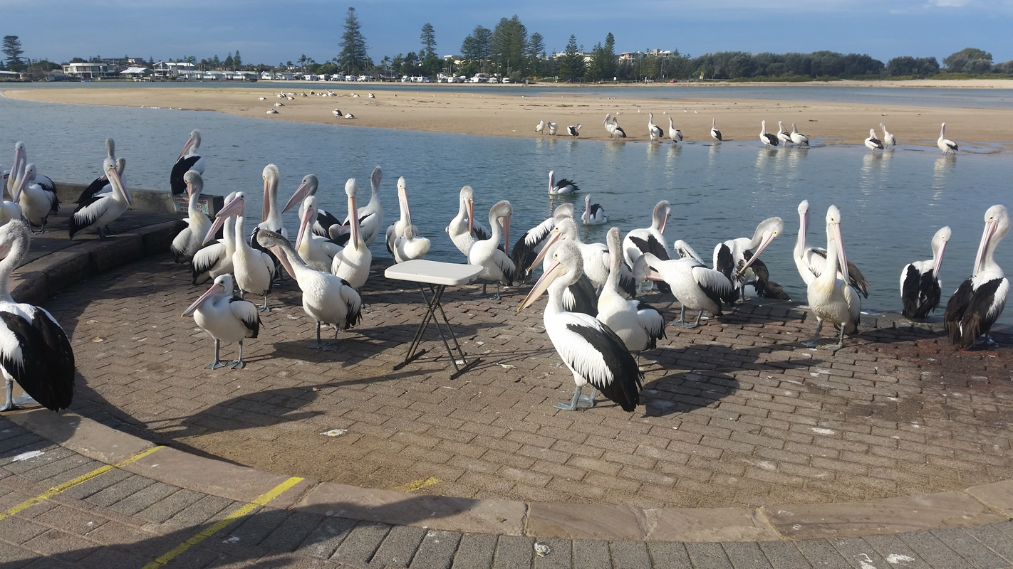 Vor drei Tagen in “Northern Entrance”, nachdem wir uns ausgiebig geduscht und einen Rochen gesehen haben, ging es dann zur Pelikanfütterung. Die saßen den ganzen Tag schon mit weiten Mäulern da und warteten bis es 15 Uhr schlug und die Fütterung begann. Wie im Schlaraffenland. Sie waren sehr aggressiv und aufdringlich, ich bekam sogar den Flügel zu spüren. Aber süß sind sie trotzdem!