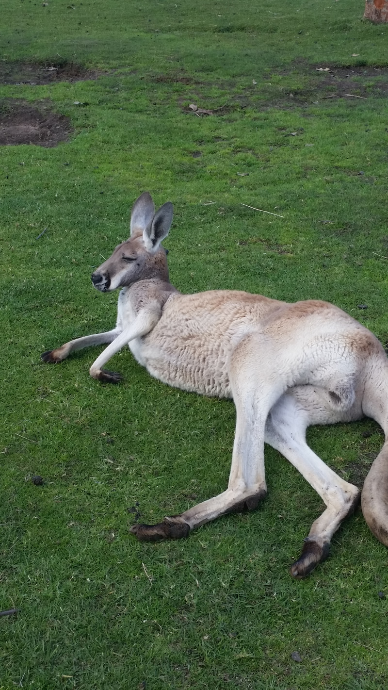 Es folgte die “Baby Fütterung” bei welcher jeder eine Flasche Milch bekam, um diese zu füttern. Die waren aggressiv, die kleinen Schafe. Es gab aber noch viele weitere Tiere dort: Koalas, der Tasmanische Teufel, Reptilien, Alpakas, Büffel, Wombats, Schweine und noch etliche weitere. Viele davon liefen frei herum. Es gab eine Kängurus Range, die offen war, sodass man