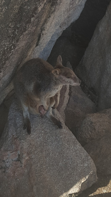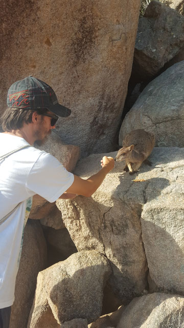 Auf dem Weg zurück zur Fähre sagte der Busfahrer auf einmal bei einem Haltestopp: Wallaby Fütterung. Roberts Ohren wurden größer und er fragte, ob wir raus wollen. Schwupps, liefen wir einer Gruppe Mädchen nach, die aber auch keinen Plan hatten, jemanden nach dem Weg fragten und wir immer hinterher. Wir lassen uns nicht abschütteln. Wir fanden uns bei großen Steinen wieder, auf und in denen wilde Wallabies leben. Sie sehen ein bisschen aus wie kleine Kängurus. Wallbies sind sehr sehr scheu, aber diese? Sobald sie es schon knistern hören, kamen sie angesprungen, ließen sich aus der Hand fressen und streicheln. Ein alter Mann verteilte kostenlos Futter und wir verliebten uns in die kleinen Beuteltiere. Eines von ihnen trug sogar ein haarloses Baby im Beutel. Ich liebe diese Insel!