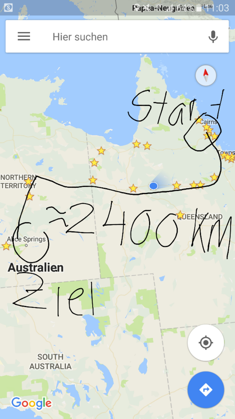 Ich wollte schon immer in das Outback. Die Küstengegend ist zwar belebt und vielseitig, aber ich finde, Australien ist nur Australien wegen seines Kerns. Und das ist: Wüste, roter Sand/Erde, frei herumspringende Kängurus und die Weite im Nichts. Nach Townsville (ja, wir mussten von Cairns wieder herunterfahren) traten wir die circa 2.400 km Strecke nach Alice Springs, die ursprüngliche Heimat der Aborigines, an. Hier befindet sich auch Ayers Rock (der rote große Stein). Das dachten wir zumindest, aber später mehr.